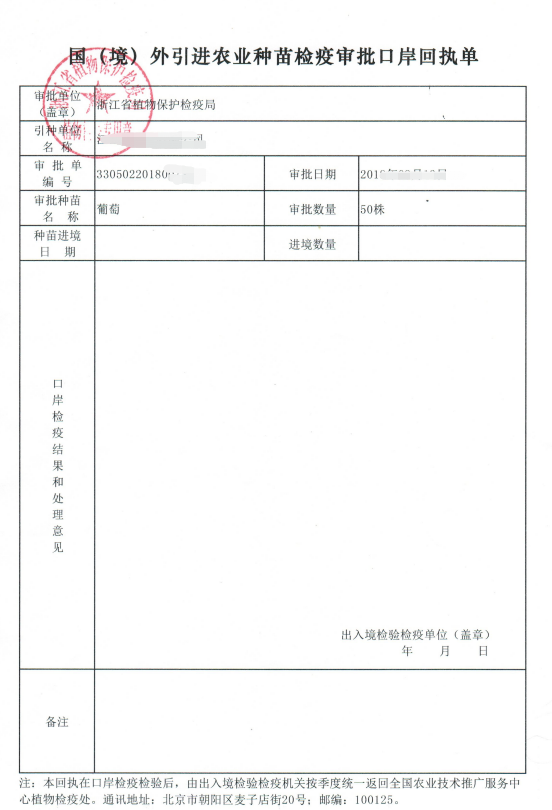 国(境)外引进农业种苗检疫审批口岸回执单